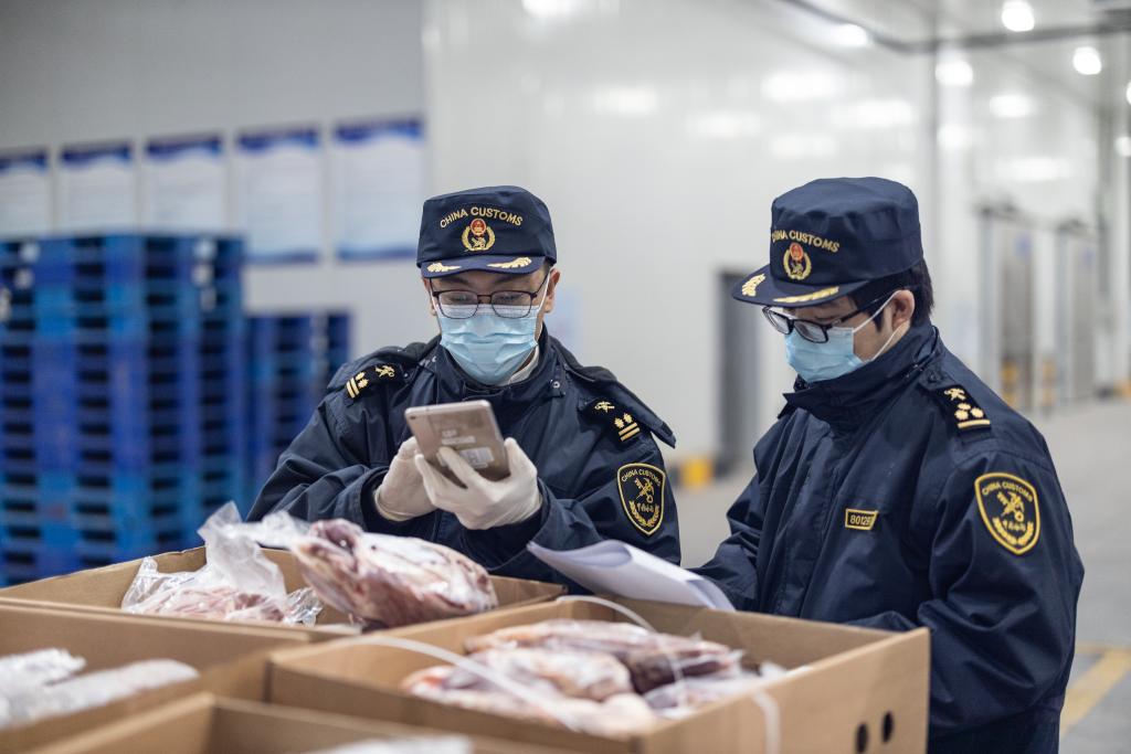 1月17日,在重慶國(guó)際物流樞紐園區(qū),重慶海關(guān)所屬渝州海關(guān)監(jiān)管科副科長(zhǎng)劉議凡(左)與同事正仔細(xì)查驗(yàn)通過中歐班列進(jìn)口的牛肉。新華社記者 黃偉 攝