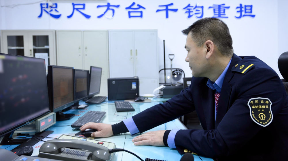 一間不大的值班室,除了床就是操作臺,“咫尺方臺 千鈞重?fù)?dān)”的條幅下,田春緊盯顯示屏。他負(fù)責(zé)運(yùn)輸組織調(diào)度,是車站“最重要”的崗位。
