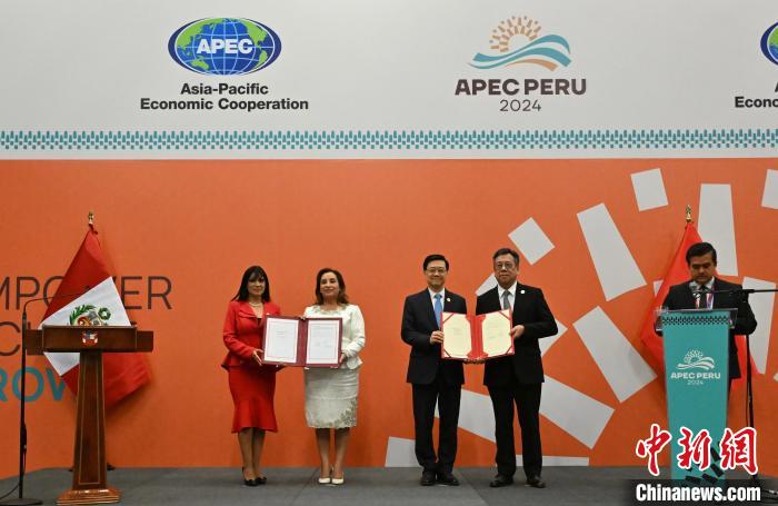 2024年11月15日,亞太經(jīng)合組織第三十一次領導人非正式會議期間,中國香港與秘魯在秘魯利馬簽署自由貿(mào)易協(xié)定。圖為秘魯總統(tǒng)博魯阿爾特(左二)、秘魯外貿(mào)旅游部部長萊昂(左一)、香港特區(qū)行政長官李家超(右三)、香港特區(qū)政府商務及經(jīng)濟發(fā)展局局長丘應樺(右二)完成簽署后合影。 香港特區(qū)政府新聞處供圖
