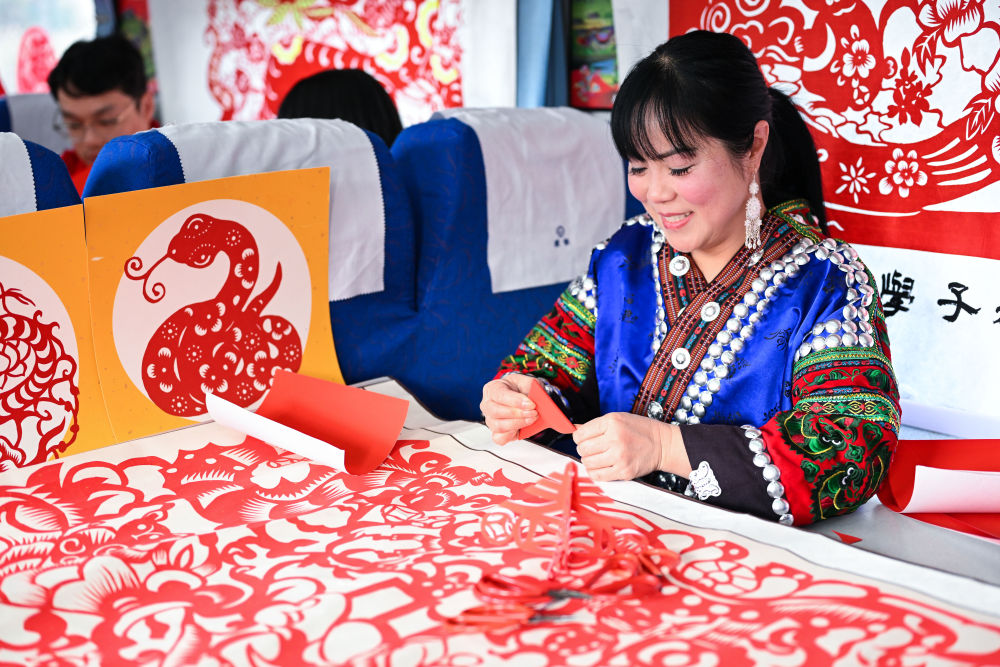1月18日,非遺傳承人在5640次列車上向乘客展示剪紙技藝。新華社記者 楊文斌 攝