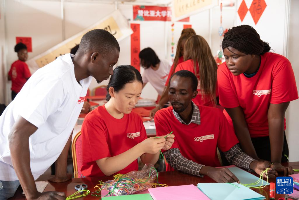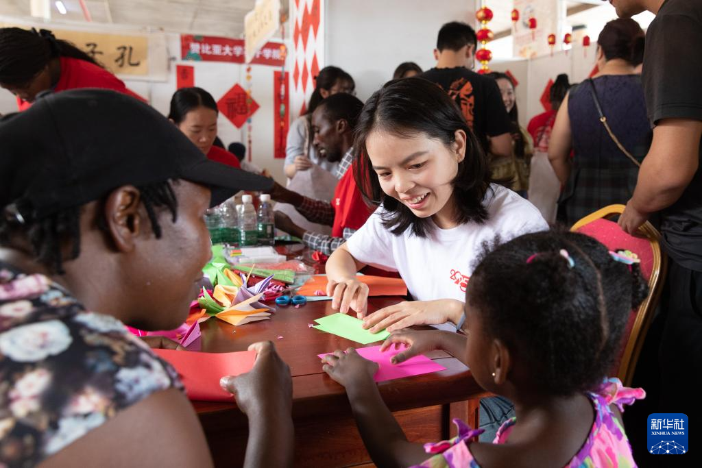 在廟會現(xiàn)場的贊比亞孔子學院展位前,人頭攢動。包括書法體驗、剪紙、折紙展示和猜字謎等豐富的文化互動項目,吸引人們紛紛參與體驗。一位贊比亞媽媽帶著孩子在老師指導下完成她的第一個中國結(jié)作品,她高興地說:“原來中國藝術(shù)這么有趣!希望我的孩子有一天可以去孔子學院學習。”