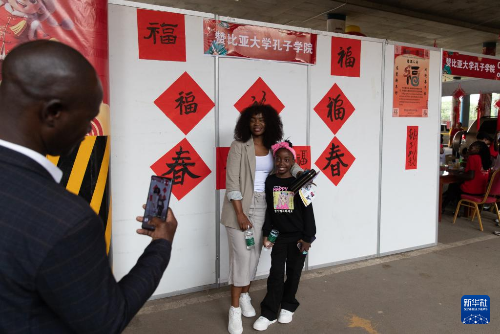 1月19日,在贊比亞首都盧薩卡舉行的春節(jié)廟會活動上,人們在贊比亞大學孔子學院的展區(qū)前合影留念。新華社記者 彭立軍 攝