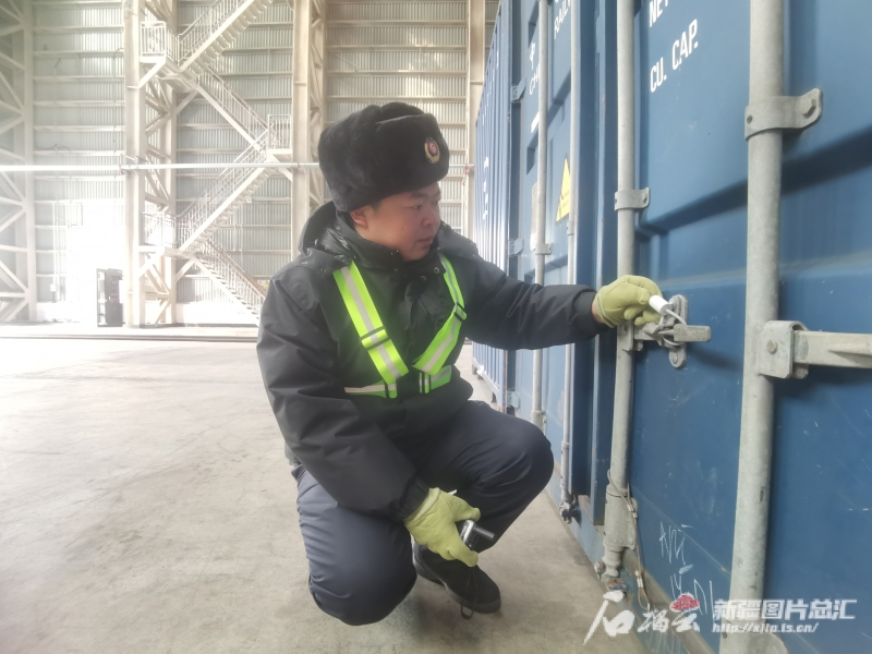 1月20日,譚磊正在阿拉山口站集裝箱換裝庫檢查集裝箱上的封印。石榴云/新疆日報記者 白素君 攝