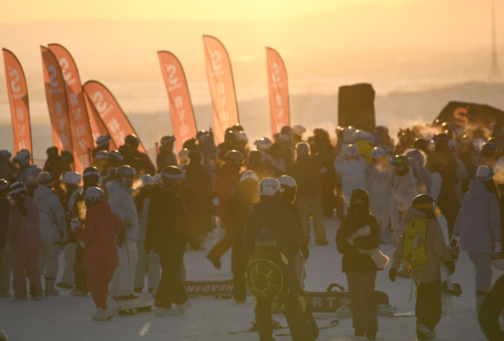 日落時分,阿勒泰市將軍山國際滑雪度假區(qū)的山頂區(qū)域人頭攢動(1月24日攝)。