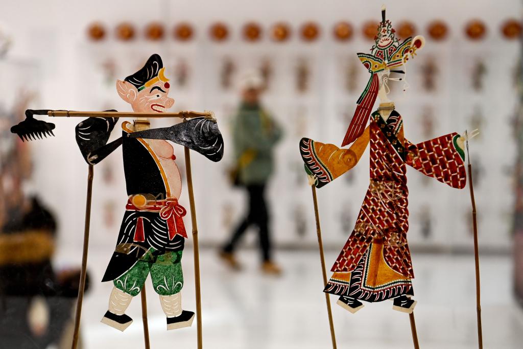 1月7日,游客在非遺年貨集市上了解皮影技藝。新華社記者 鄒競一 攝