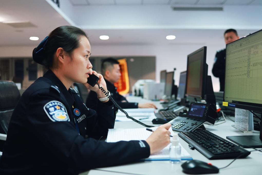 指揮中心,民警李思雨在接聽電話。新華社記者 任沁沁 攝