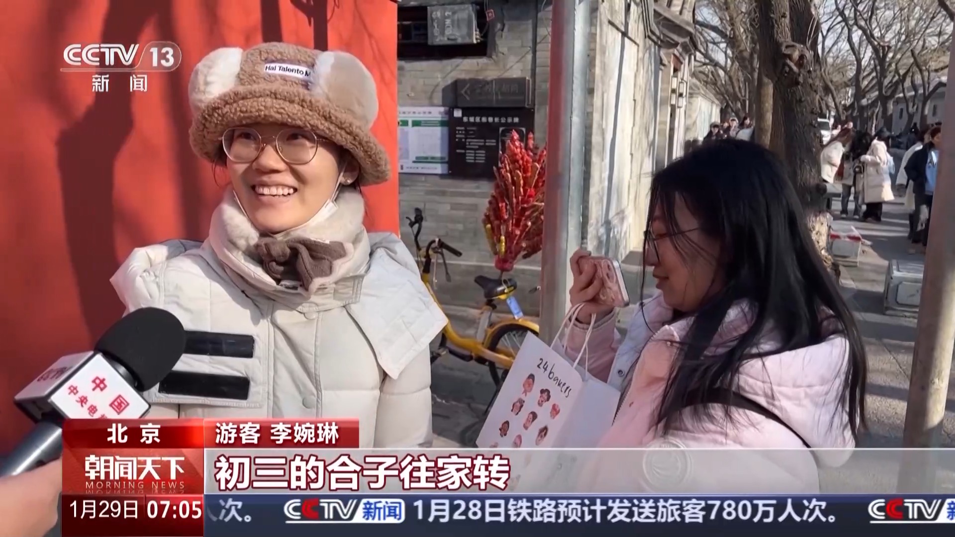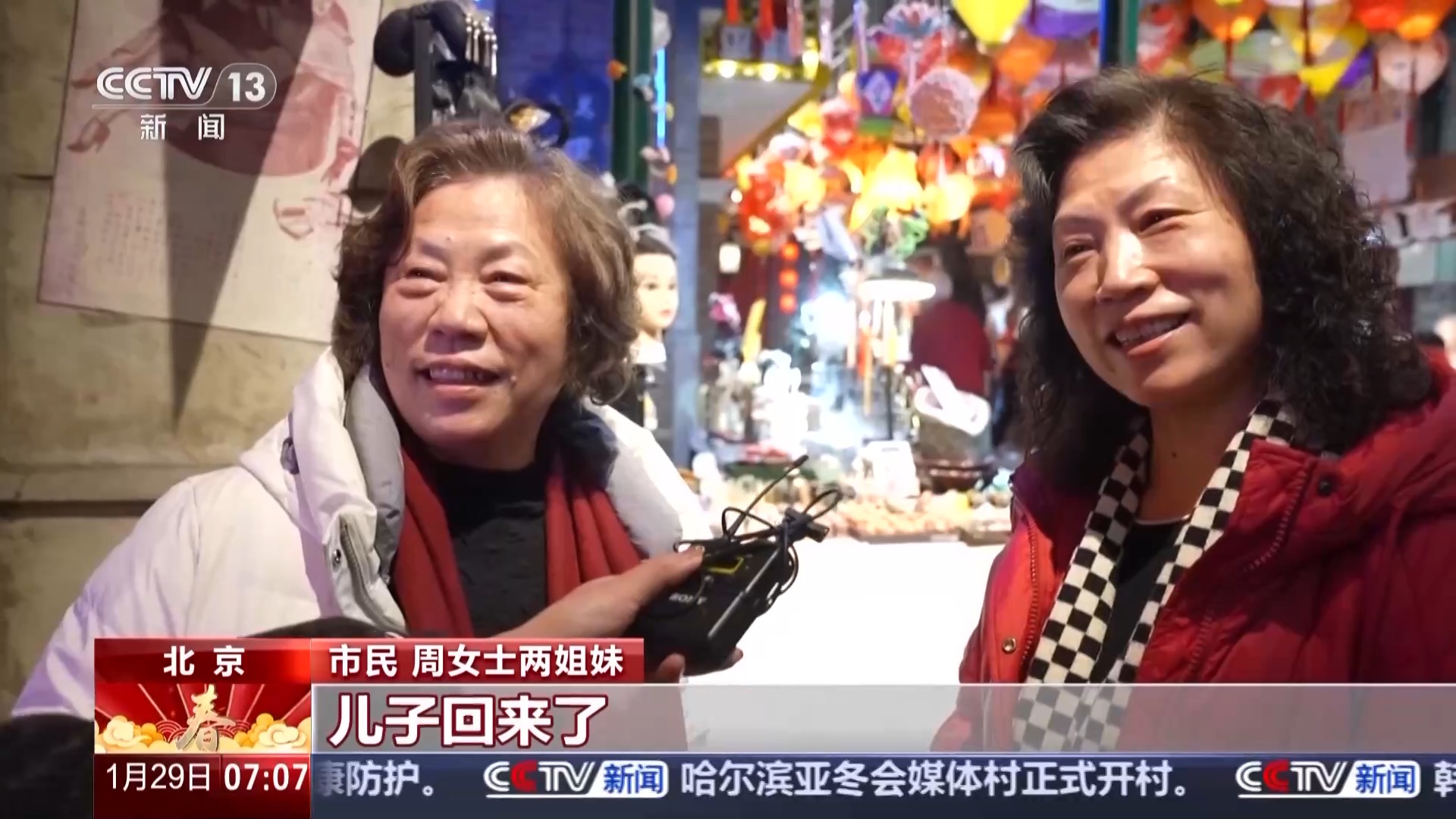 北京市民 周女士兩姐妹:跟兒子一起過。兒子回來了,跟兒子一起逛廟會,吃北京的小吃,豆汁、麻豆腐、焦圈,這都是北京的最愛。大家一起團團圓圓,談天說地,回憶這一年所走過的路程,展望未來。國家好,是家庭也好,孩子們都好,老年人生活更好。