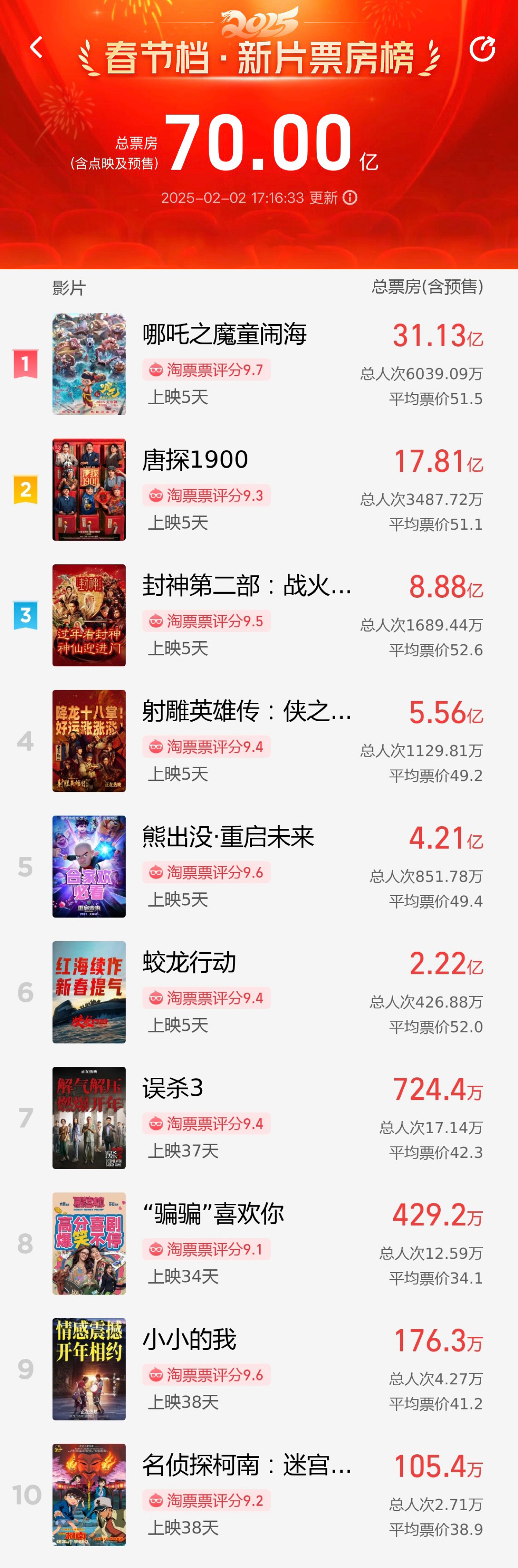 其中,《哪吒之魔童鬧海》票房突破30億
