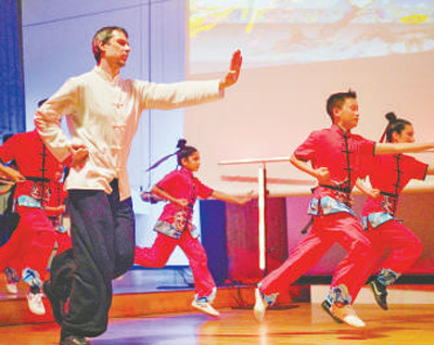 在2025年柏林及勃蘭登堡中國(guó)留學(xué)生蛇年春節(jié)聯(lián)歡晚會(huì)上,當(dāng)?shù)貙W(xué)生表演武術(shù)節(jié)目《中國(guó)武魂》。記者 劉 赫攝