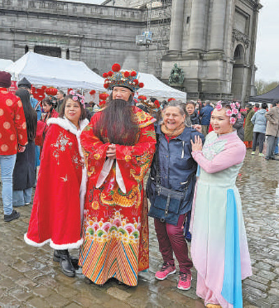 在比利時(shí)布魯塞爾舉辦的“中國(guó)春節(jié)游園廟會(huì)”上,當(dāng)?shù)赜^眾與廟會(huì)演員合影。記者 牛瑞飛攝
