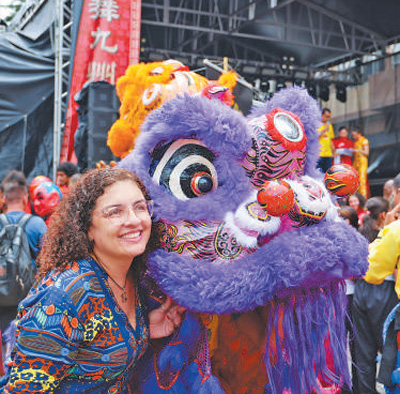 當(dāng)?shù)貢r(shí)間2月1日,在巴西圣保羅市中心自由廣場(chǎng)舉辦的歡樂春節(jié)園游會(huì)開幕式上,當(dāng)?shù)孛癖娕c舞獅表演者合影。記者 時(shí)元皓攝
