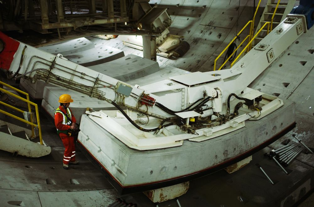 點(diǎn)點(diǎn)“星光”盡頭,拼裝班長周洪強(qiáng)操作伸縮機(jī),將一塊隧道管片緩緩抓起。穩(wěn)穩(wěn)平移、旋轉(zhuǎn)過后,12噸重的管片精準(zhǔn)落位。