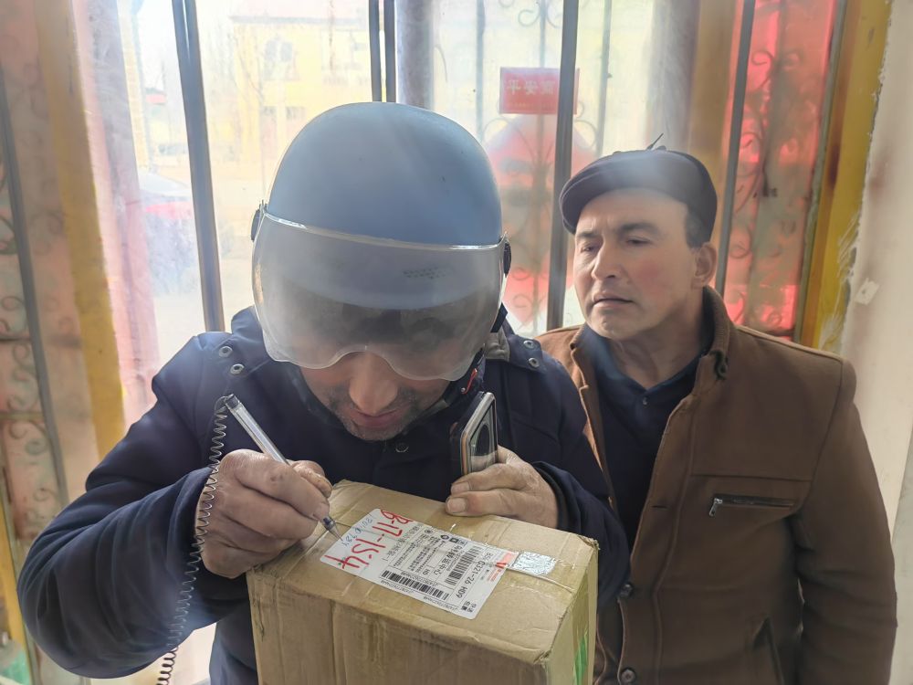 這是1月18日拍攝的新疆喀什市荒地鄉(xiāng)一快遞代收點(diǎn)顧客取快遞照片。新華社記者蔡國棟 攝
