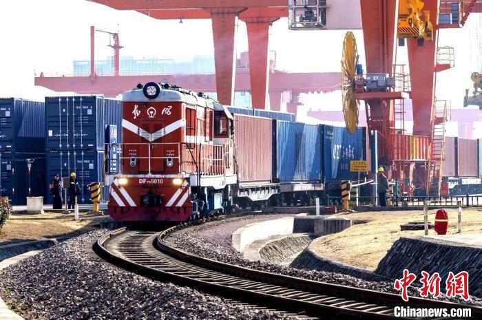 近日,一列裝載著100個(gè)標(biāo)箱貨物的中歐班列從浙江金華駛往中亞。胡肖飛攝
