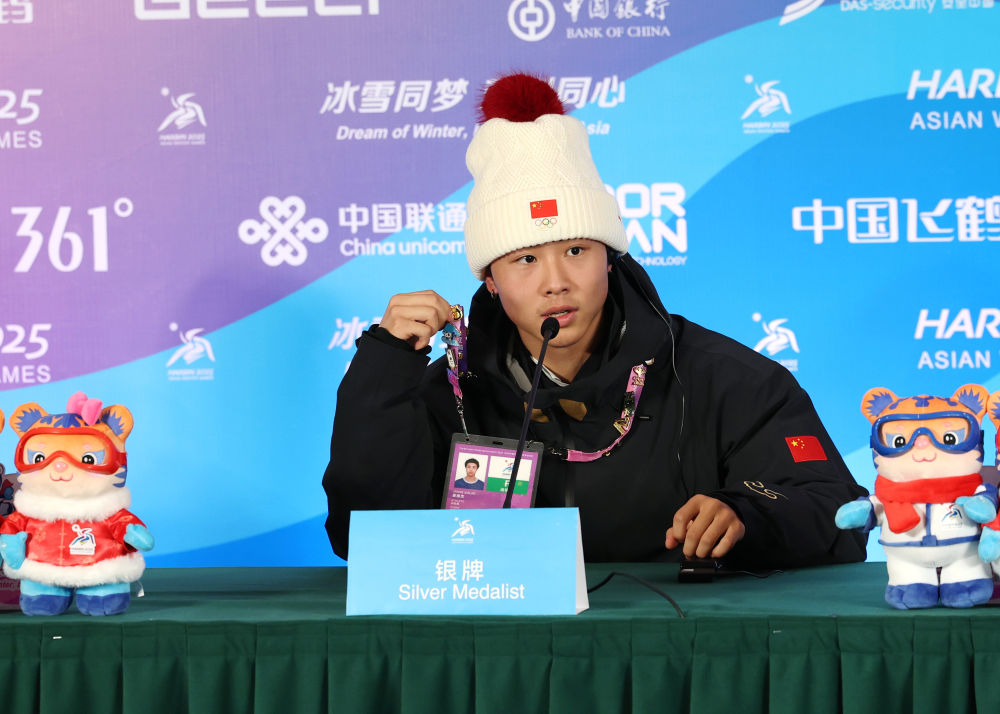 2月10日,中國(guó)選手姜鑫杰在發(fā)布會(huì)現(xiàn)場(chǎng)介紹他與其他運(yùn)動(dòng)員交換來(lái)的徽章。新華社記者 張晨霖 攝