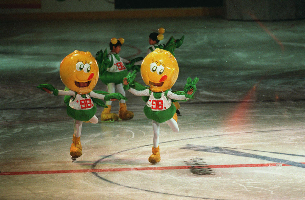 在哈爾濱舉行的第三屆亞冬會開幕式上,大型藝術(shù)表演《太陽·冰雪·亞細(xì)亞》中,本屆亞冬會吉祥物豆豆伴隨著活潑的兒歌,在冰上歡快地滑行。新華社記者 羅更前 攝(傳真照片,1996年2月5日發(fā))