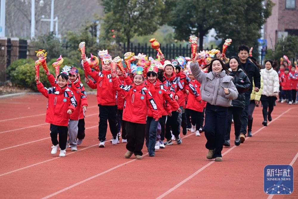 2月14日,合肥市園上園小學(xué)喻崗分校師生在開學(xué)典禮上進(jìn)行“貪吃蛇”接力跑活動(dòng)。新華社記者 周牧 攝