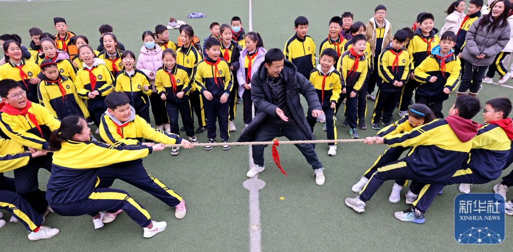 2月14日,山東省棗莊市市中區(qū)東湖小學(xué)學(xué)生們在參加拔河比賽。新華社發(fā)(孫中喆攝)