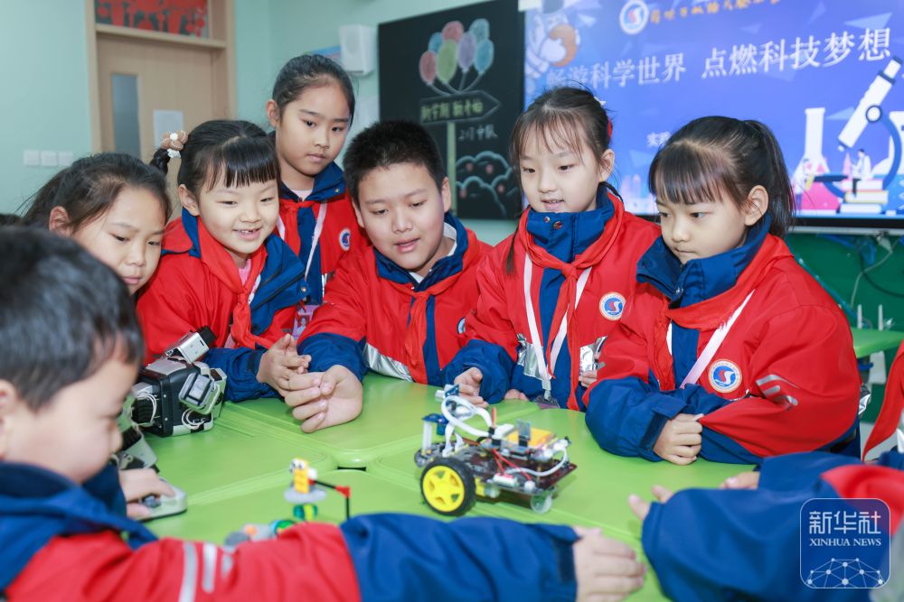 2月14日,在山東省棗莊市薛城區(qū)雙語實(shí)驗(yàn)小學(xué),學(xué)生們與編程機(jī)器人互動(dòng)。新華社發(fā)(王龍飛攝)