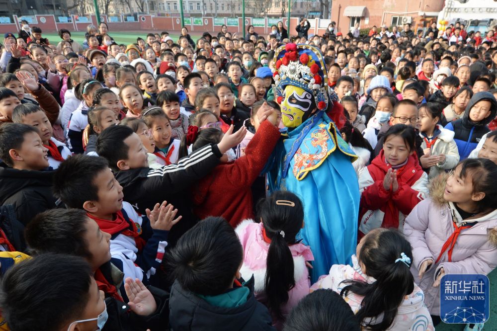 2月14日,學(xué)生們在山東青島四方小學(xué)“傳統(tǒng)文化潤童心”主題活動(dòng)中與川劇變臉演員互動(dòng)。新華社發(fā)(王海濱攝)