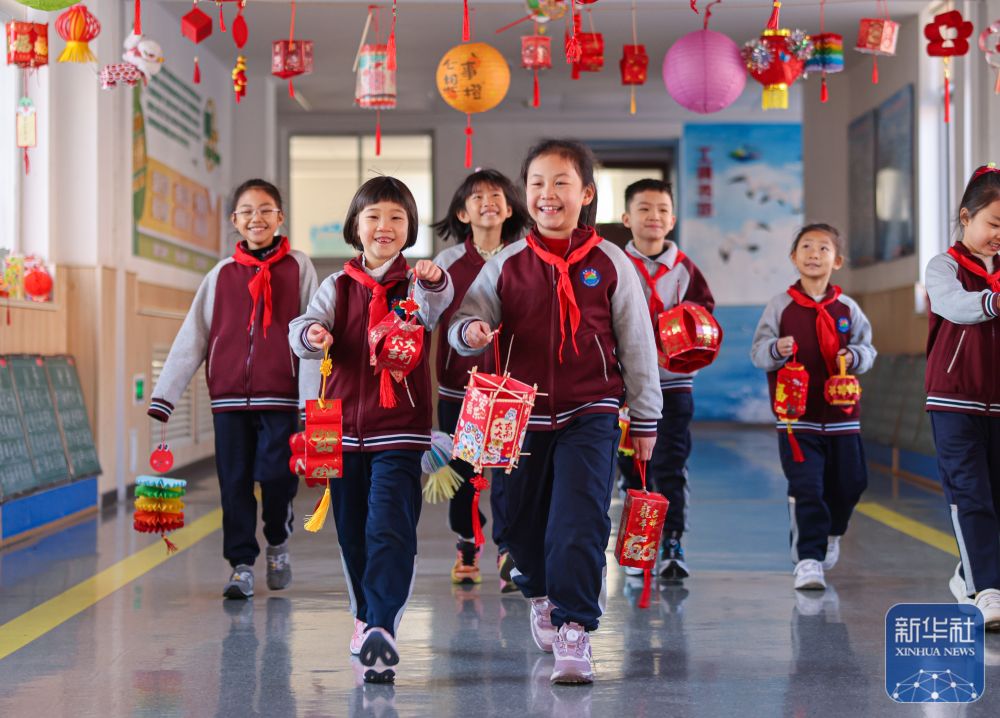 2月14日,在山東省榮成市實(shí)驗(yàn)小學(xué),學(xué)生們展示自己的手工作品。新華社發(fā)(李信君攝)