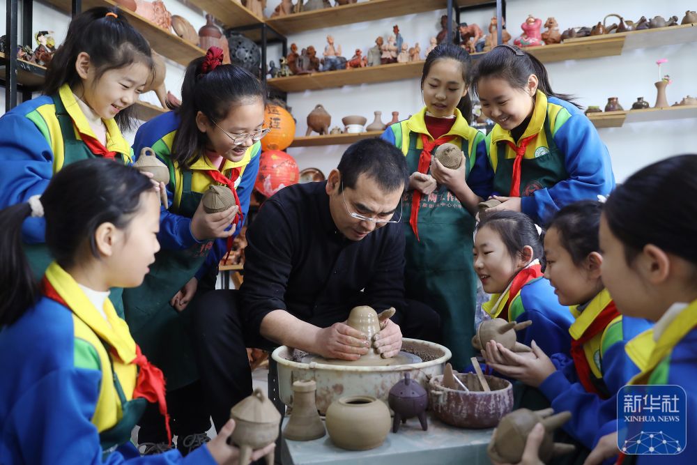2月14日,在山東省滕州市龍泉街道中心小學(xué),老師在教學(xué)生們制作土陶。新華社發(fā)(孫楊攝)