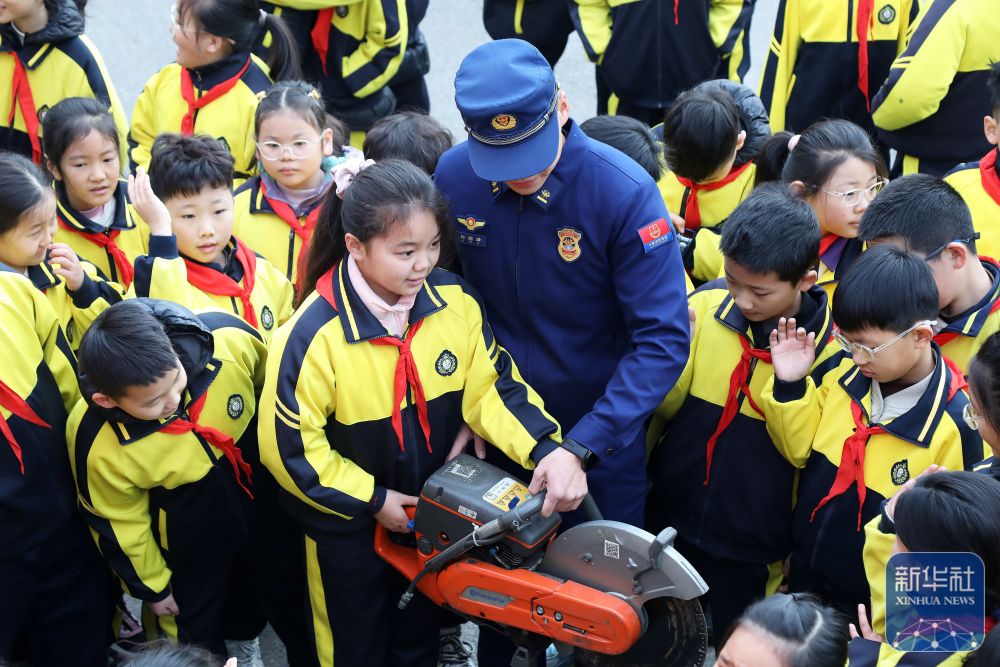 2月14日,在山東省臨沂市郯城縣北城實(shí)驗(yàn)小學(xué),消防救援人員為小學(xué)生講解消防裝備器材。新華社發(fā)(張春雷攝)