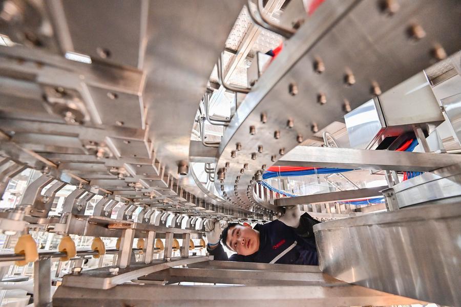 2月14日,在山東省青州經(jīng)濟開發(fā)區(qū)一家灌裝設(shè)備制造企業(yè),工人在車間內(nèi)裝配作業(yè)。新華社發(fā)(王繼林攝)