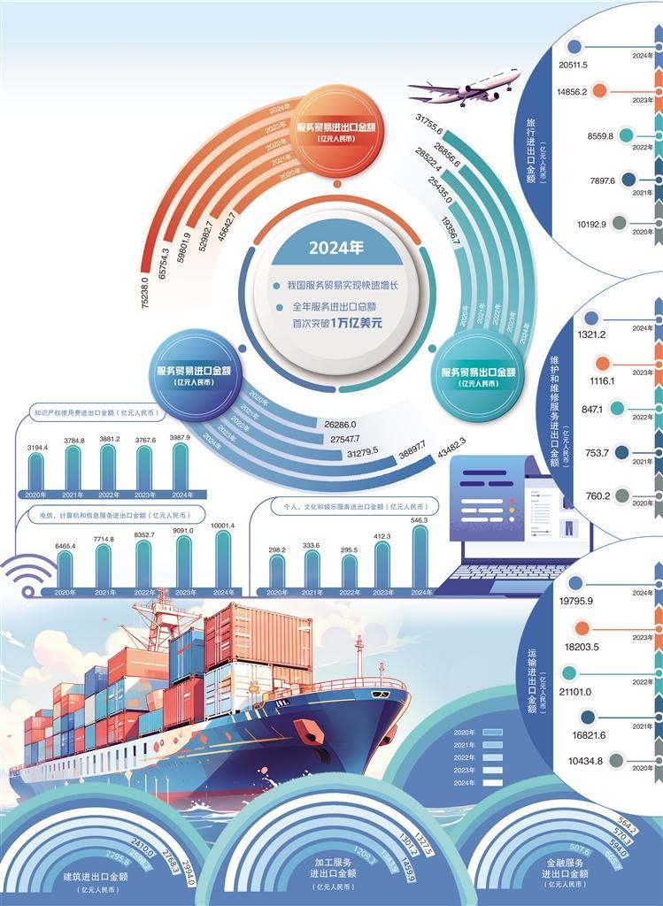 商務(wù)部數(shù)據(jù)顯示,2024年我國服務(wù)進(jìn)出口總額達(dá)7.5萬億元人民幣,同比增長14.4%,服務(wù)貿(mào)易規(guī)模首次突破1萬億美元,再創(chuàng)歷史新高。我國服務(wù)貿(mào)易實現(xiàn)了令人矚目的快速增長,展示了經(jīng)濟(jì)發(fā)展的活力和韌性,背后是多個領(lǐng)域的協(xié)同發(fā)力。