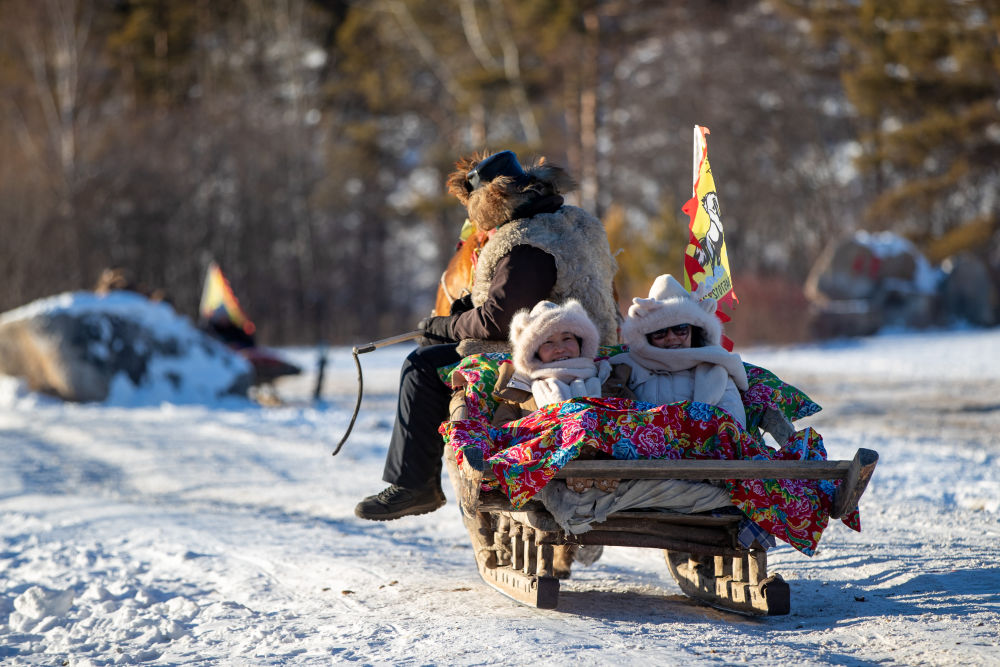 游客在漠河市北極村游玩(2024年2月2日攝)。