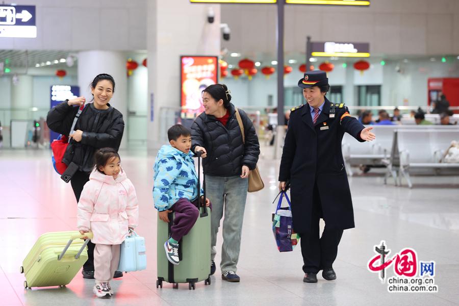 2025年春運期間 ,南昌站工作人員為旅客指引候車位置。中國網(wǎng)發(fā) 劉慕/攝