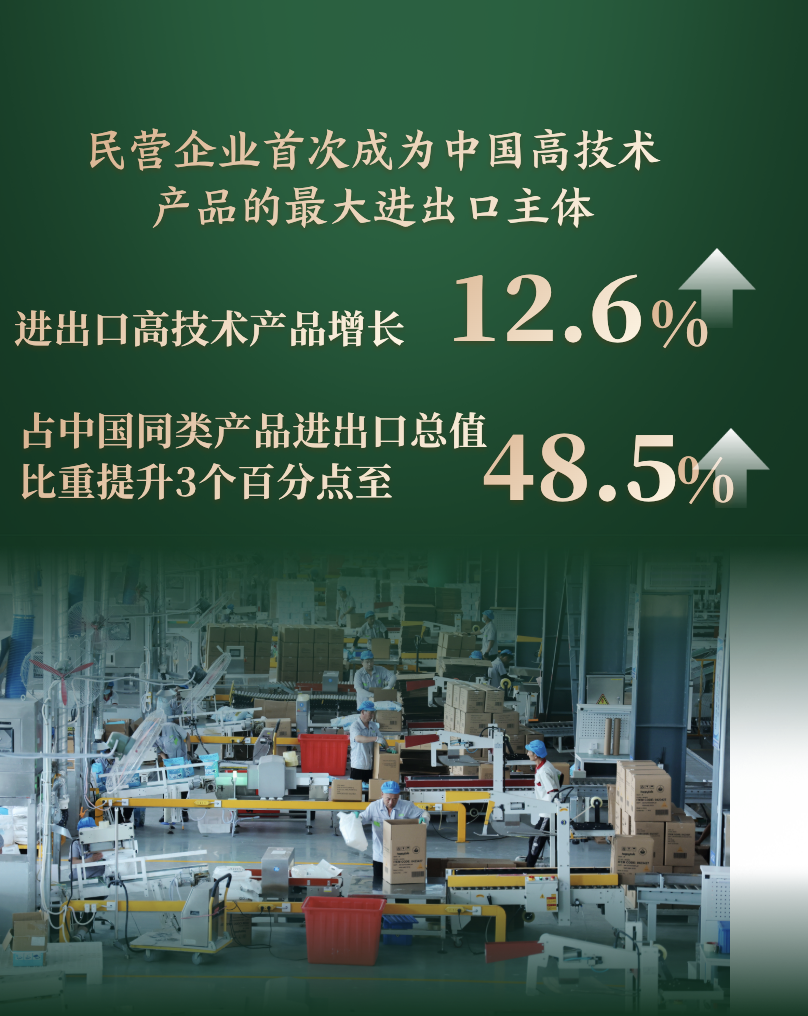 民營企業(yè)首次成為中國高技術(shù)產(chǎn)品的最大進出口主體,進出口高技術(shù)產(chǎn)品增長12.6%,占中國同類產(chǎn)品進出口總值比重提升3個百分點至48.5%。