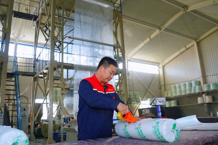 在新疆吉木薩爾縣,工人在切割、封裝生產(chǎn)下線的地膜。