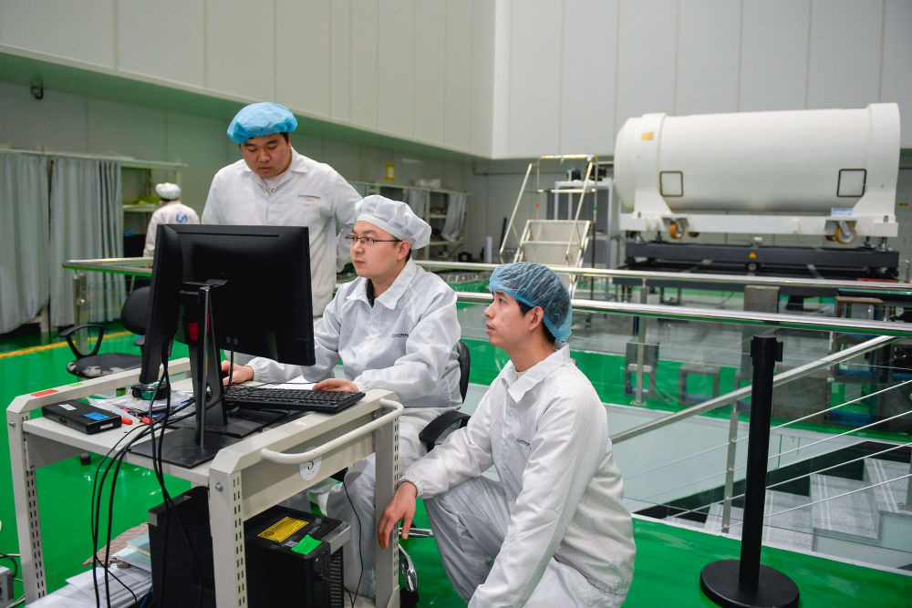 在長光衛(wèi)星相機裝調間,王升(右二)在調試衛(wèi)星光學遙感載荷組件時與團隊成員討論細節(jié)。