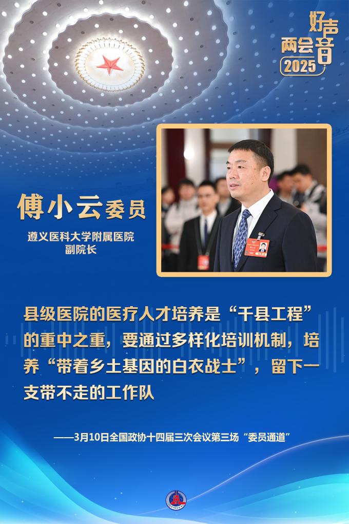 “國家持續(xù)實施‘千縣工程’,開展醫(yī)療人才‘組團式’支援幫扶,支援西藏、新疆、青海等地區(qū)醫(yī)院和國家鄉(xiāng)村振興重點幫扶縣人民醫(yī)院?!弊窳x醫(yī)科大學附屬醫(yī)院副院長傅小云委員說。