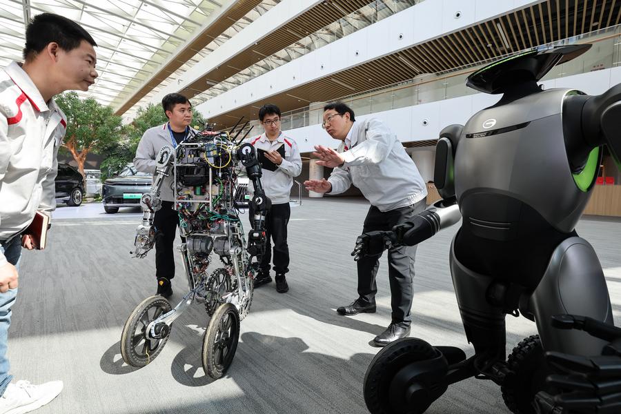 2025年2月24日,全國人大代表馮興亞(右一)在廣州向廣汽第三代具身智能人形機(jī)器人團(tuán)隊(duì)工程師了解該型機(jī)器人的AI自主控制技術(shù)突破和應(yīng)用場景創(chuàng)新情況。新華社記者 劉大偉 攝