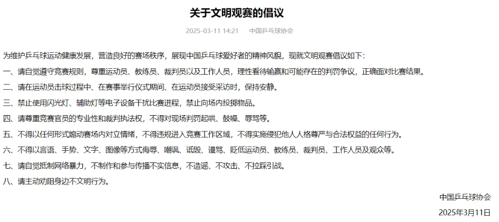 中國乒乓球協(xié)會11日在官網(wǎng)發(fā)布《關(guān)于文明觀賽的倡議》,其中提到理性看待輸贏、抵制網(wǎng)絡(luò)暴力等八項內(nèi)容。