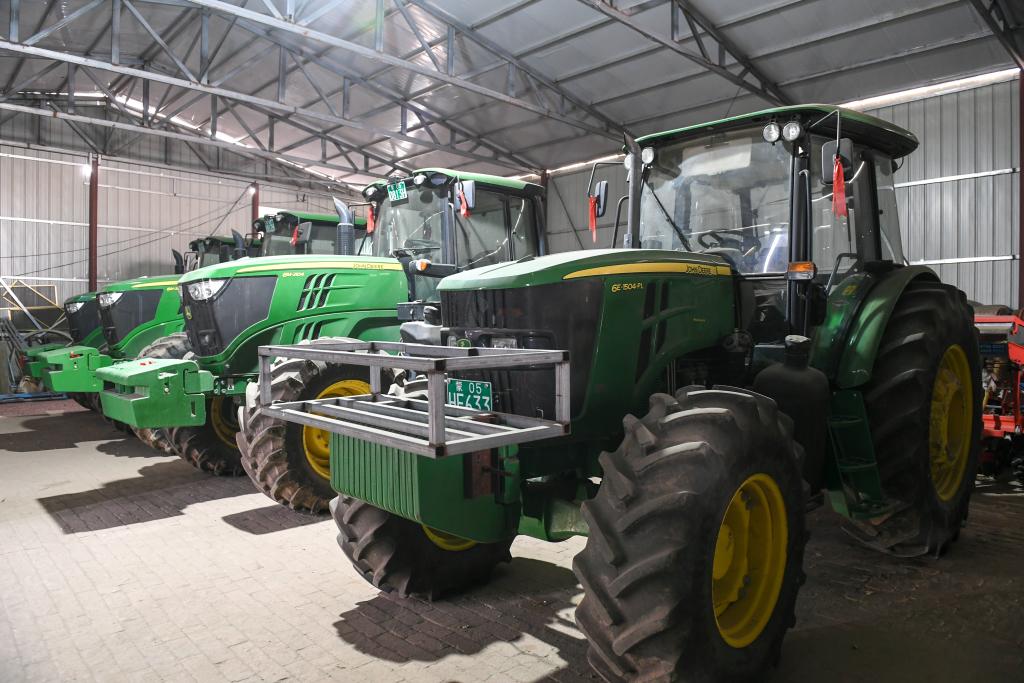 兩臺(tái)嶄新的拖拉機(jī)僅車(chē)轱轆就一人多高。陳胡日查說(shuō),這種拖拉機(jī)省油、效率高,一天能種300多畝地。