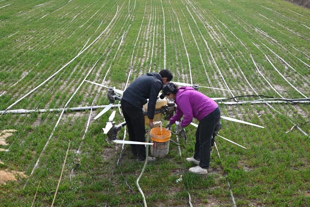 3月18日,在新疆喀什地區(qū)英吉沙縣一麥田,努日曼古麗和丈夫在為無(wú)人機(jī)添加農(nóng)藥。新華社記者 尹茹紅 攝