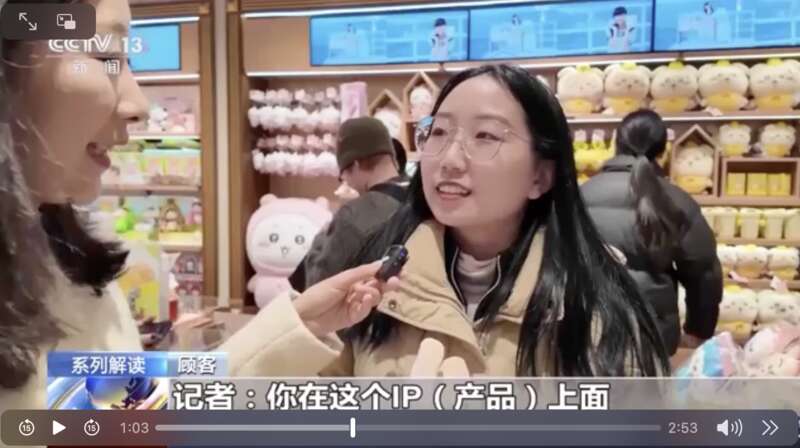 北京朝陽區(qū)的一家IP聯(lián)名店,可以看到首發(fā)、首秀的國產周邊衍生品。截圖來自央視新聞