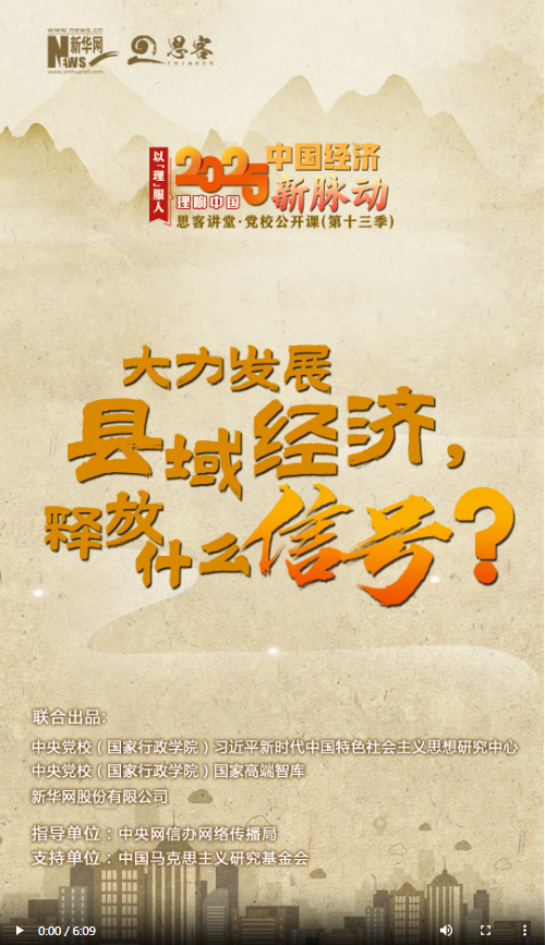 新一季“思客講堂·黨校公開(kāi)課”《理響中國(guó)·以理服人|2025中國(guó)經(jīng)濟(jì)新脈動(dòng)》,帶你讀懂2025年經(jīng)濟(jì)工作重點(diǎn)?!扒|大縣”不斷擴(kuò)容,縣域消費(fèi)“多點(diǎn)開(kāi)花”,“縣域”二字越來(lái)越火,成為經(jīng)濟(jì)發(fā)展的關(guān)鍵詞。2025年政府工作報(bào)告和2024年中央經(jīng)濟(jì)工作會(huì)議都強(qiáng)調(diào)要大力發(fā)展縣域經(jīng)濟(jì),這釋放了什么信號(hào)?中央黨校(國(guó)家行政學(xué)院)社會(huì)和生態(tài)文明教研部教授王曉莉?qū)Υ诉M(jìn)行解讀。