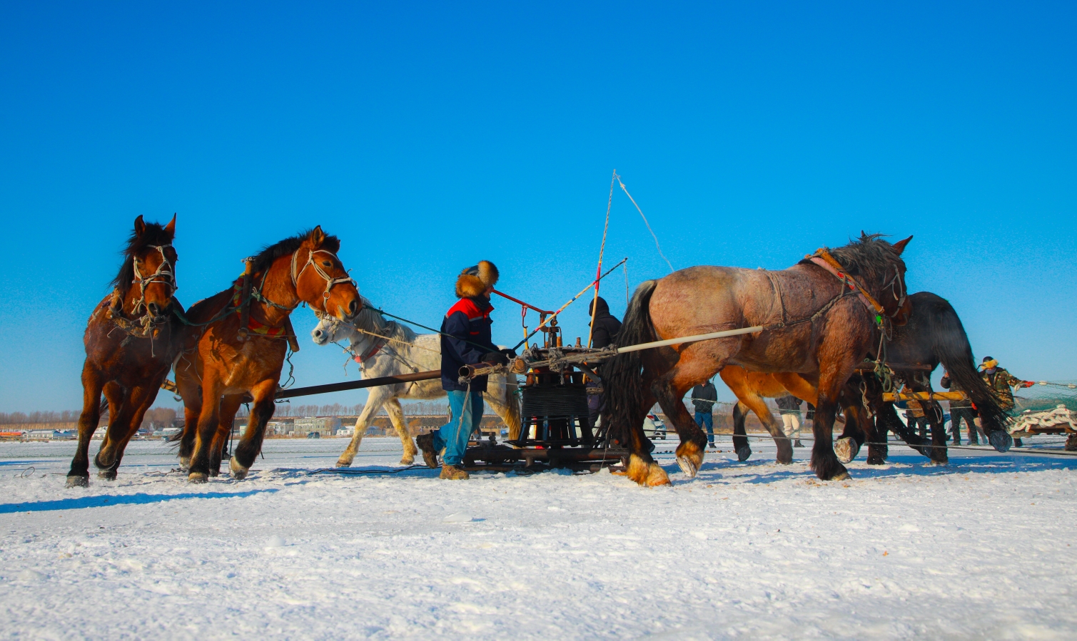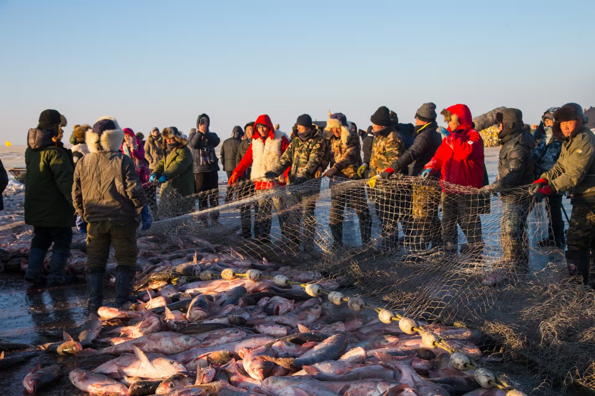 祭湖醒網(wǎng)、馬拉絞盤(pán)、冰下走網(wǎng)……一場(chǎng)冬捕盛宴正在千里冰封的查干湖上演。頭戴狐皮帽、身披羊皮襖、手持令旗的“魚(yú)把頭”一聲令下,巨大的漁網(wǎng)被緩緩從冰下拉出,隨著數(shù)萬(wàn)條活魚(yú)從水中“躍”起,“冰湖騰魚(yú)”的盛景讓傳承千年的漁獵文化在冰天雪地中再度“沸騰”。