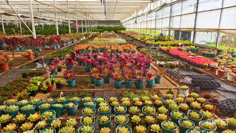 一盆盆色彩斑斕的多肉植物,分門別類地?cái)[放在大棚里(央廣網(wǎng)記者 郝振青 攝)
