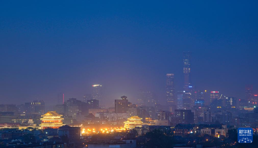 北京日落后的正陽(yáng)門(mén)城樓、箭樓和遠(yuǎn)處的CBD建筑群(4月14日攝)。新華社記者 陳曄華 攝