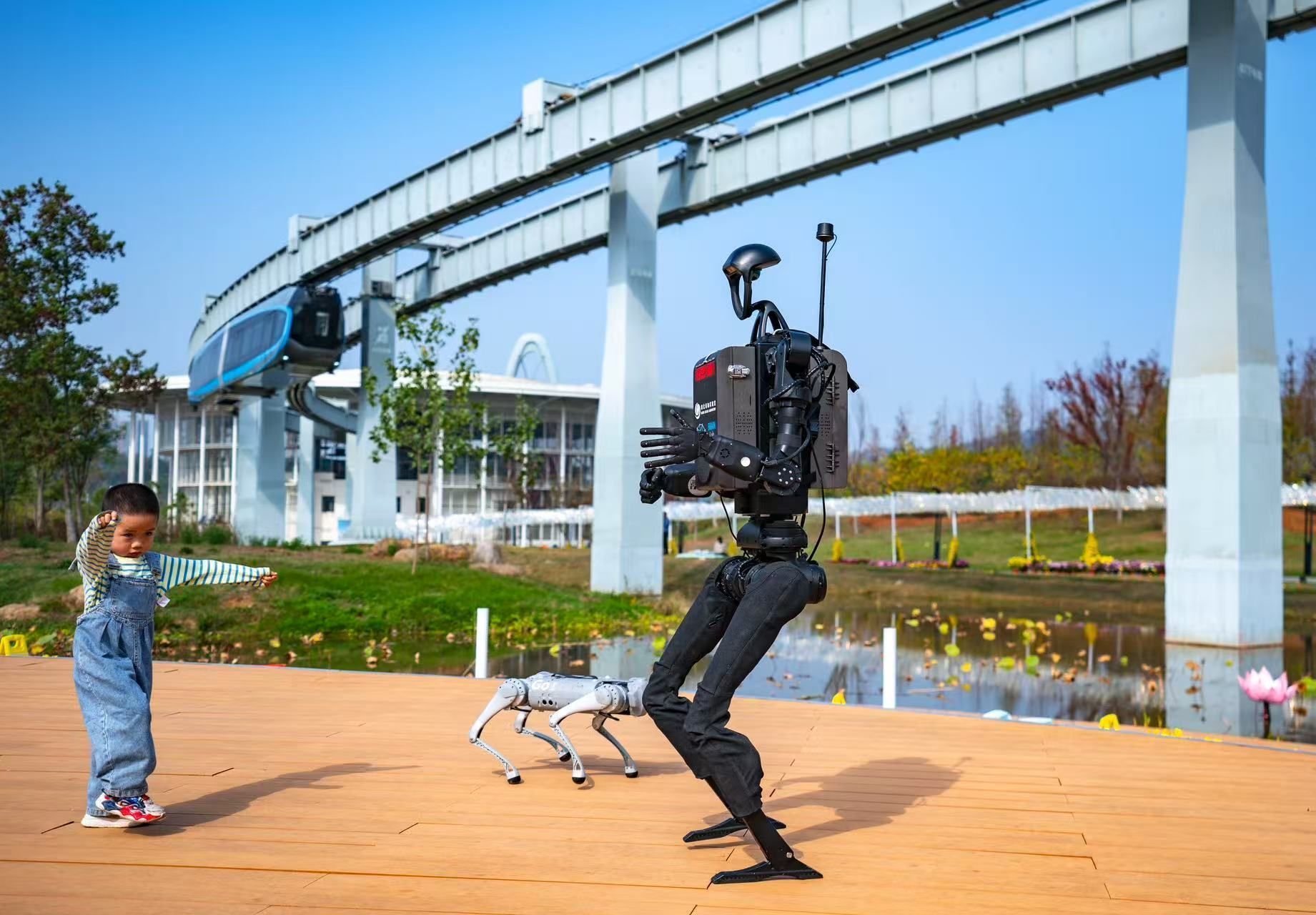 在武漢東湖高新區(qū)空軌高新大道站,一輛空軌列車正在駛過;生態(tài)大走廊上,裝載了光谷造“大腦”的人形機器人和四足機器狗,正與看AI展的小朋友斗舞。