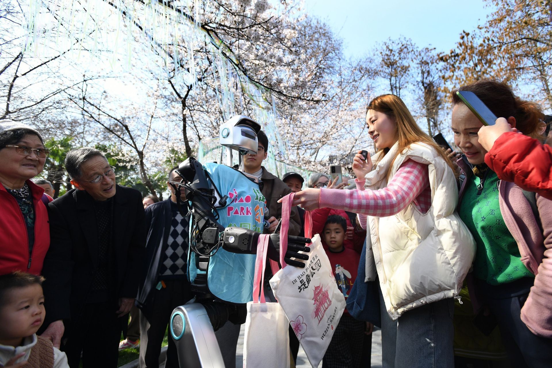 3月19日,堤角公園,人形機器人“小天”穿過櫻花云廊,精準避開奔跑的孩童。