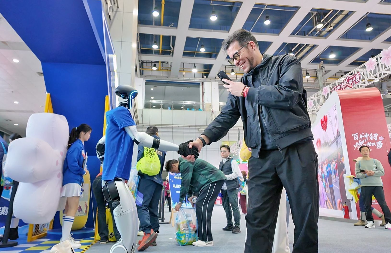 3月20日,在武漢國際會展中心,2025武漢馬拉松迎來了首個參賽選手報到領物日。委內瑞拉選手吳瑞龍看見人形機器人志愿者,開心地上前與它握手。