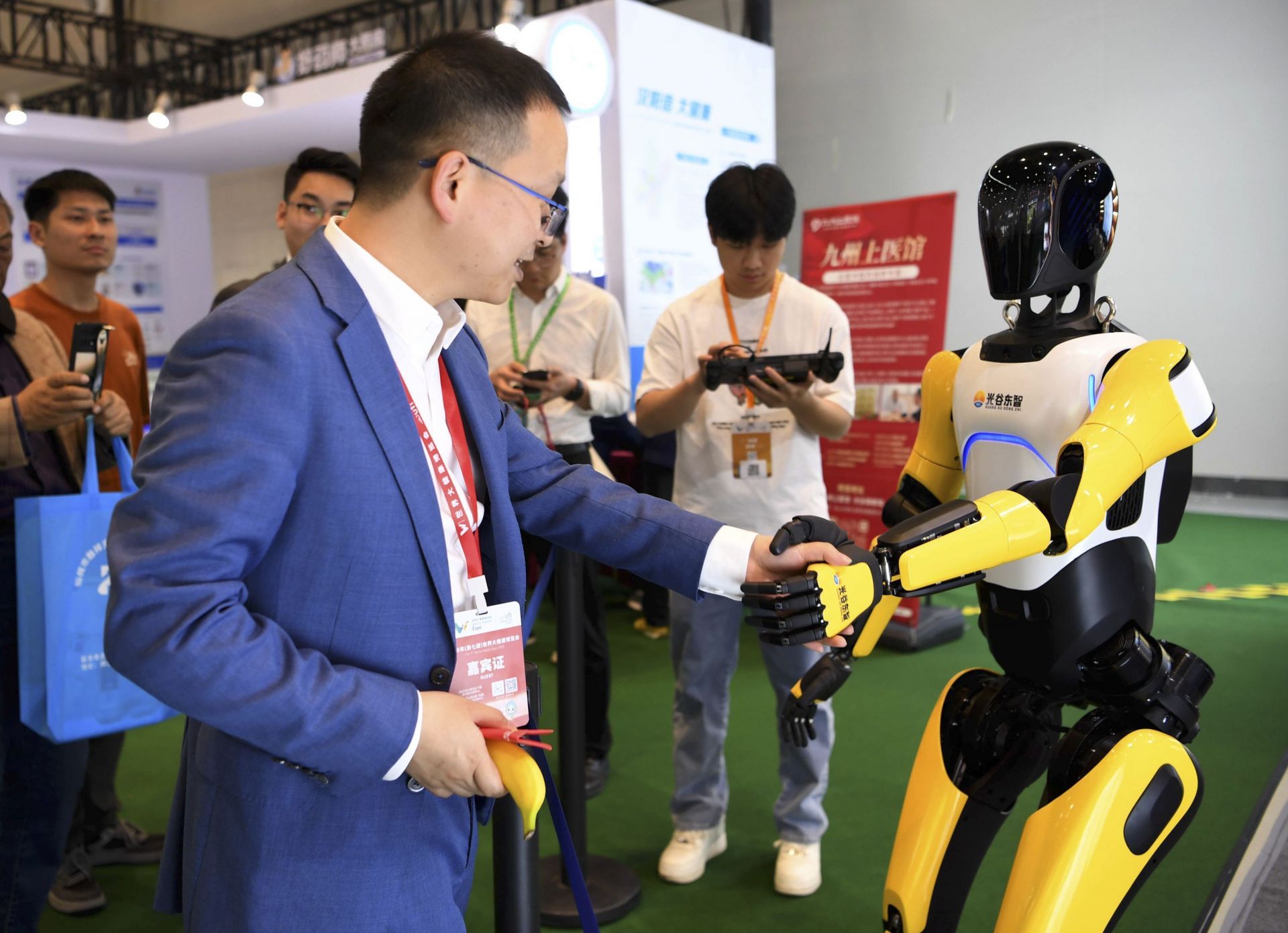 光谷東智科技展示的A2智能機器人吸引了大家的目光,不少觀眾與它握手互動。4月8日,2025年第七屆世界大健康博覽會上,智能機器人紛紛登臺。