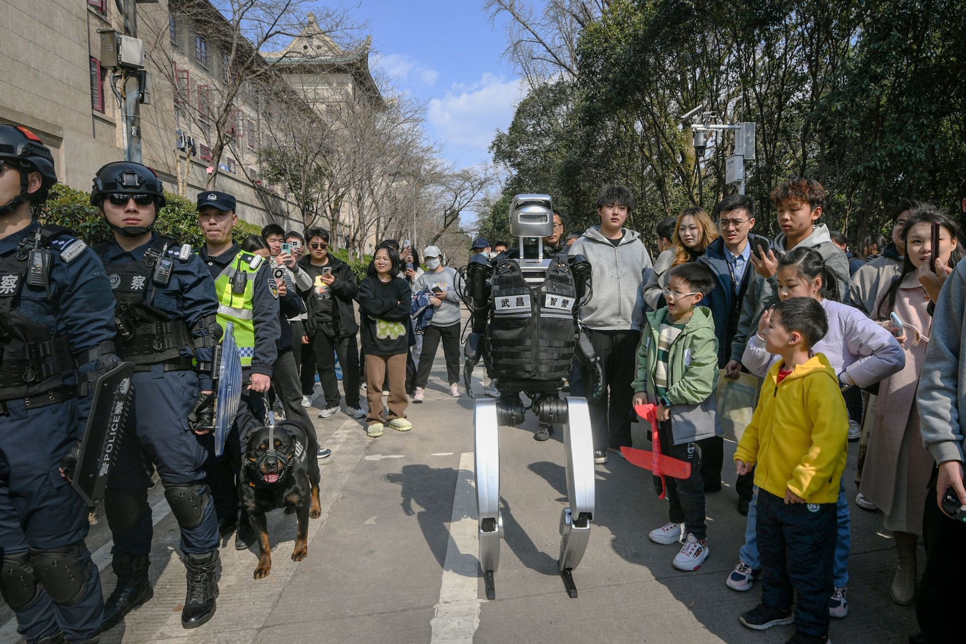 3月16日,武漢大學櫻花大道上,一臺身著黑色馬甲的人形機器人“智警小珞”穿梭在賞櫻人群中。