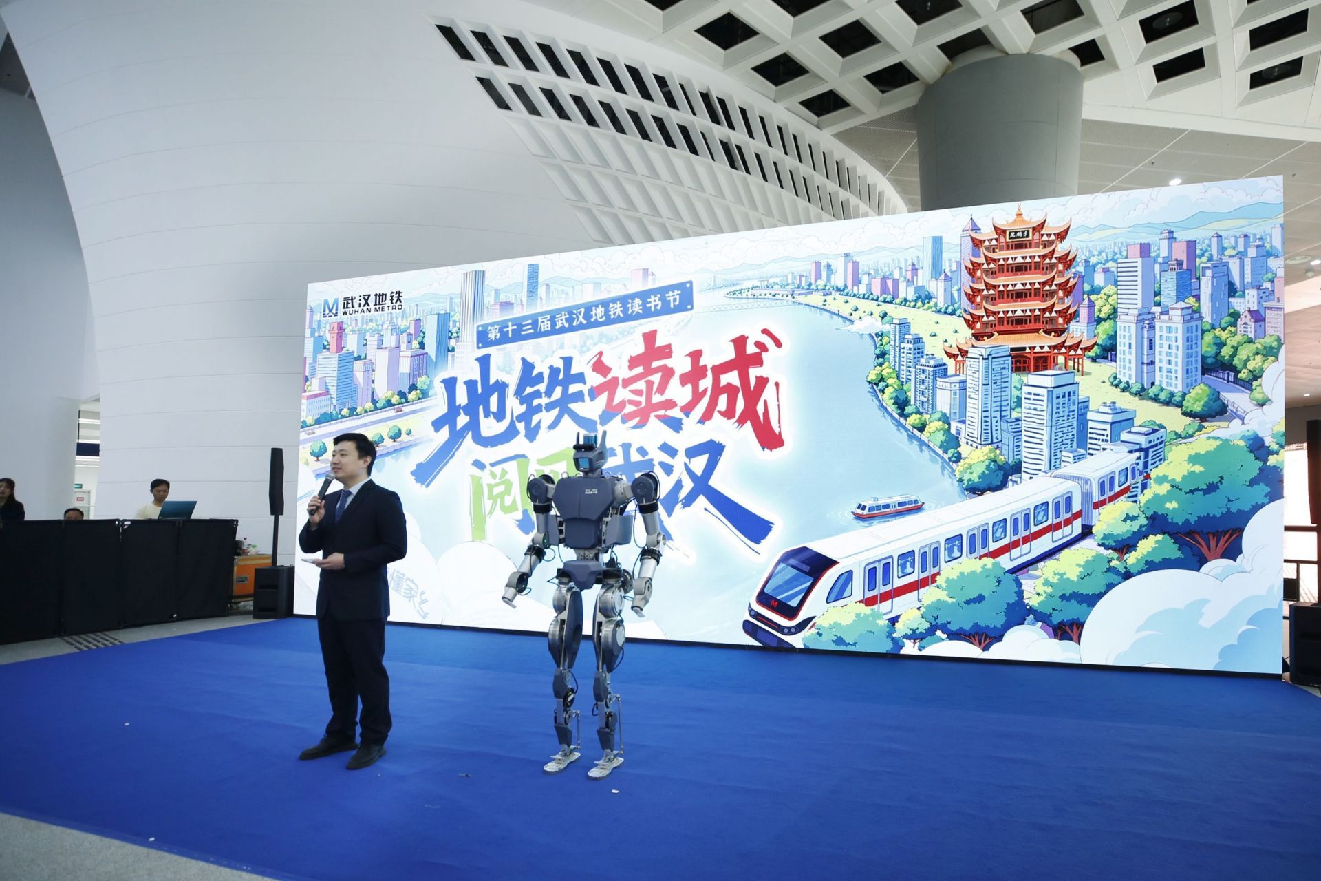 4月10日,第十三屆武漢地鐵讀書節(jié)活動在光谷廣場環(huán)形站廳拉開帷幕,由華中科技大學陳學東院士團隊與武漢格藍若共同研制,擁有出色負載能力的湖北明星機器人“勞動者3號”登上主舞臺,擔任活動嘉賓主持。